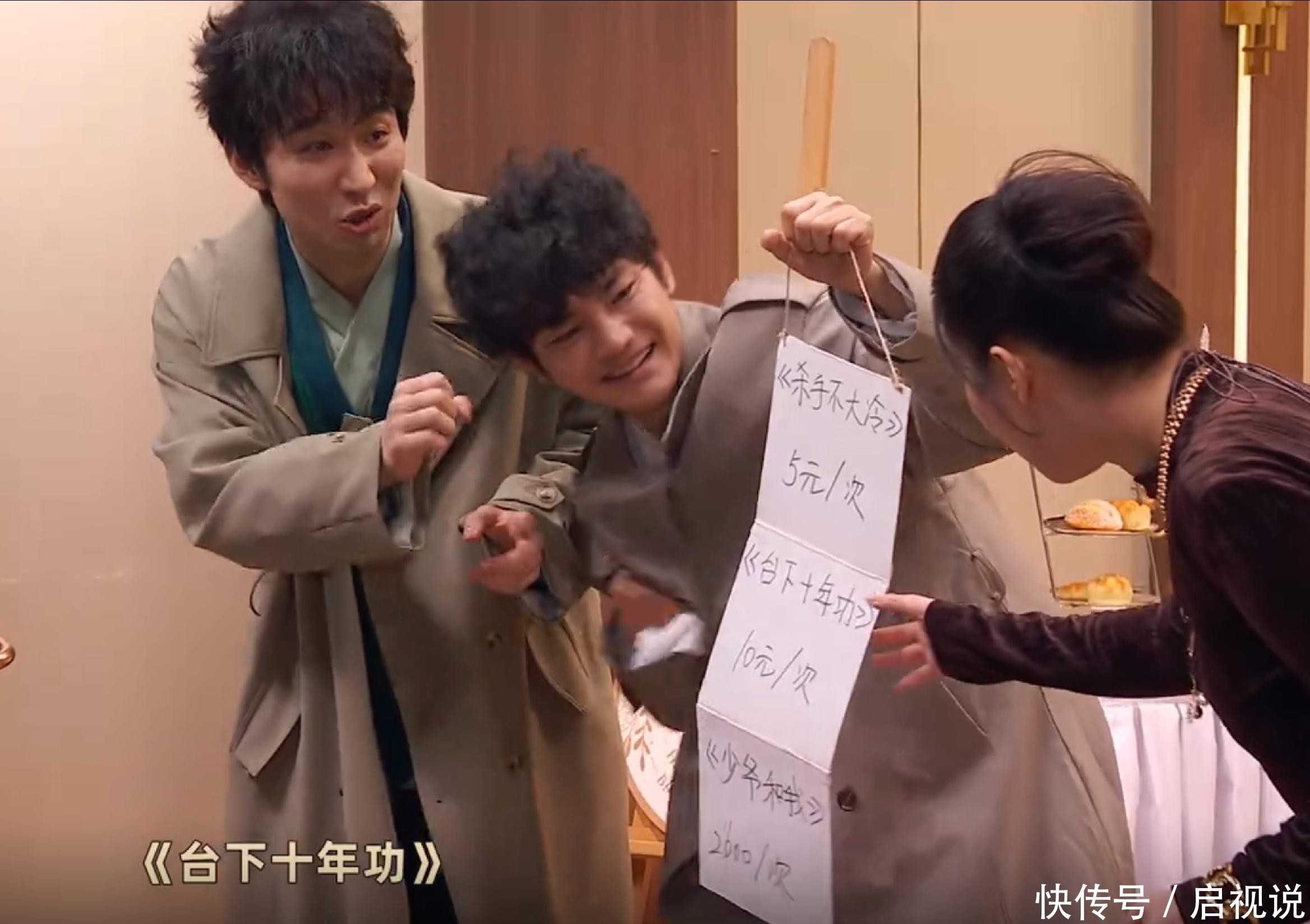 42. 到了《项总今天为何这样》,他们干脆扮演起“一喜时期的逐亚”,开场跳的是《女友来了》的舞蹈,手中节目单列出的剧目包括《杀手不大冷》《台下十年功》,甚至还有《少爷和我》。